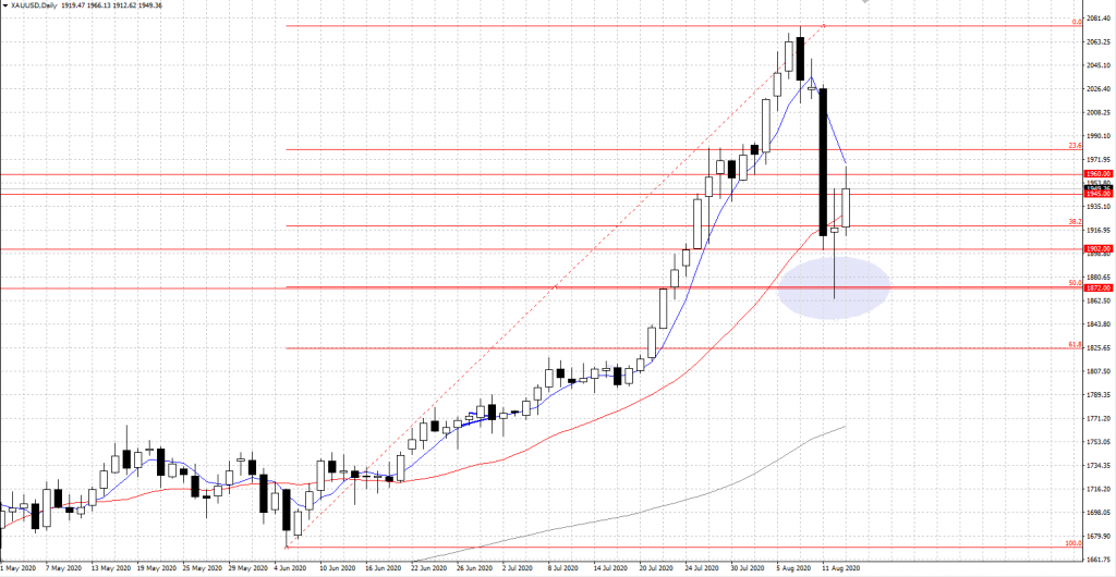 Günlük grafiğe baktığımız zaman 5 Haziran günü başlayarak tarihi zirvenin fiyatlandığı 5 Ağustos gününe kadar fibo çektiğimiz zaman geri çekilmeleri tam olarak yüzde 50 seviyesine denk gelen $1872 bölgesinden destek bulduğunu söyleyebiliriz. Alıcıların iştahının artmasıyla yükselişe geçen emtiada alım temposunun devam etmesi durumunda $1960 ve kritik $2000 seviyeleri gündemimizde olacaktır. Bu direnç bölgelerinin aşılması halinde emtiada yeni bir tarihi zirve yolculuğu izleyebiliriz. Küresel risk iştahının artması durumunda güvenli limanlardan olası çıkışlarda $1940 – $1890 ve fibo 50 seviyesi olan $1872 destek bölgelerine kadar tekrar bir geri çekilme temposu izleyebiliriz.
