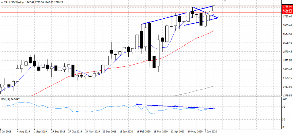 18 Mayıs zirvesinin üzerinde çıkan emtiada yukarı yönlü atakların yaşandığını görmekteyiz. Küresel tarafta endişelerin artması ile güvenli liman talebini karşılayan emtianın 2012 yılından bu yana en yüksek seviyelere çıktığını görmekteyiz. Haftalık grafikte RSI indikatöründe negatif uyumsuzluk görsek te temel analizin fiyatlamalarda daha etkili olduğunu söyleyebiliriz. Yukarı ataklarda 2012 yılının seviyelerinden 1769 – 1785 ve 1793 direnç seviyelerini takip edeceğiz. Bu seviyelerinde aşılması halinde 1800 lü seviyelerden bahsedebiliriz. Olası aşağı yönlü hareketlilikte 1765 altına geçilmesi halinde olası düzeltmenin derinleşebileceğini söyleyebiliriz. Bu durumda $1740 ve $1725 seviyelerini destek olarak takip edeceğiz.