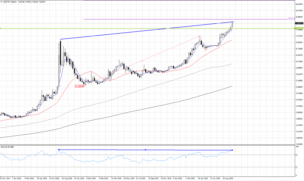 Azerbaycan ile Ermenistan arasındaki gerginlikten dolayı TL varlıklarındaki değer kayıplarının zirve seviyelere çıktığını görmekteyiz. Kritik 8.0000 bölgesinin hemen altında fiyatlanan pariteye genel çerçevede baktığımızda 5.1000 seviyesinden başlayan yükseliş trendinin fibo expansion %61.8 seviyesinin 8.0000 seviyesine denk geldiğini görmekteyiz. Bu bilginin yanı sıra yine haftalık grafikte baktığımızda RSI indikatöründe negatif uyumsuzluk olduğunu görmekteyiz. İlerleyen günlerde olası düzeltme hareketlerinde 7.6000 destek bölgesini takip edeceğiz. Bu bölgenin altına sarkma olması durumunda kurdaki tansiyonun törpülenmesini bekleyebiliriz. Alıcıların fiyatlamalara destek olması halinde kritik 8.0000 seviyesini takip edeceğiz. Bu kritik bölge öncesi 7.9300 bölgesini ara direnç olarak izleyeceğiz.