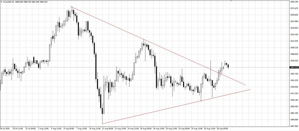 Jackson Hole sonrası güvenli liman özelliği ön plana çıkan emtiada yükselişler gözlemliyoruz. Bu yükselişe gerek Powell’ın açıklamaları gerek Covid-19 vakalarındaki artışın sebep olduğunu söyleyebiliriz. Üçgen formasyonun üst bölgesinde yukarı yönde hareketlenen emtiada bu üçgenin kırılması yönünde fiyat hareketleri izlemekteyiz. Özellikle $2000 üzerine çıkabilmesi durumunda alım momentumunun artabileceğini söyleyebiliriz. Bu psikolojik seviye öncesinde $1990 bölgesinin fiyatlamalara direnç olabileceğini söyleyebiliriz. Olası düşüşlerde $1960 – $1920 ve $1910 destek bölgeleri yine takibimizde olacaktır.