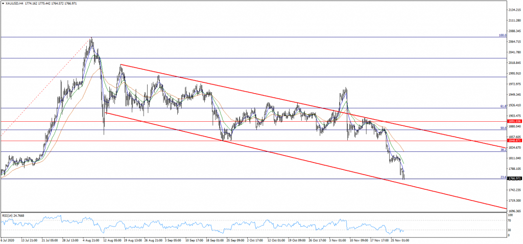 Son dönemde gelen pozitif aşı haberleri ve ABD seçimlerine yönelik Trump’ın Biden hükümeti ile geçiş sürecini başlatacağı söylemi ile rahatlayan piyasalarda risk alma iştahı yükseldi. Bu durum da riskten korunma güdüsü ile talep gören enstrümanlara satış baskısı getirdi. Ons altında yaşanan geri çekilmeyi bu yönde yorumlayabiliriz. Özellikle günlük grafikleri baz aldığımızda 200 periyotluk üssel ortalamanın geçtiği 1800 desteğinin kırılması ile satış baskısının bir hayli sertleştiğini gördük. Bu sayede 1765 desteğinin hemen üzerinde fiyatlamaları izlemekteyiz. Yalnız orta vadeli alçalan kanal formasyonu alt bandı olarak takip ettiğimiz 1755 desteği gerilemenin devamı adına çok daha önemli olacak. Şayet bu destek seviyesinin kırılmasını sağlayacak satış baskısının oluşması ile sarı metalde 1725 ve ardından 1692 seviyesi potaya girebilir.