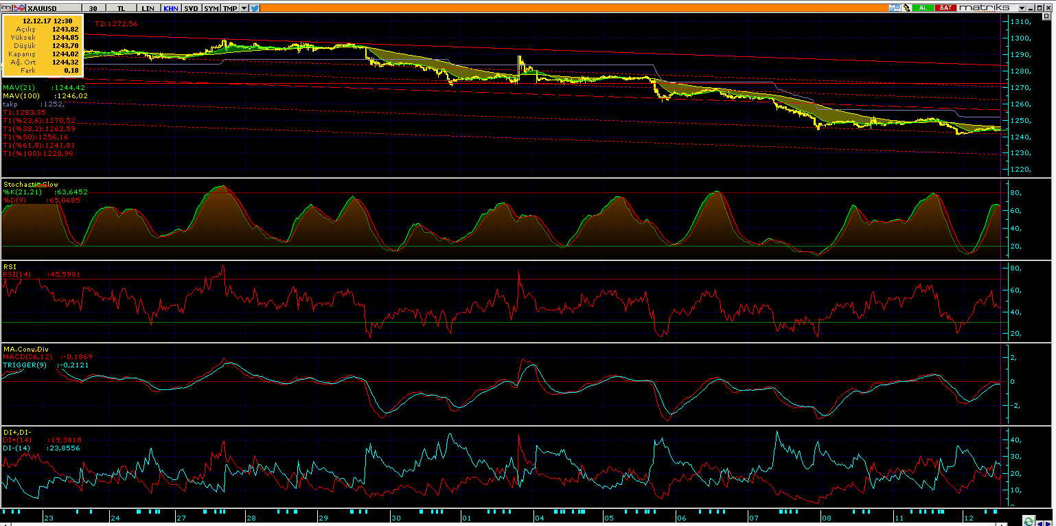 XAUUSD: Dolara bağlı para ve emtialarda olduğu gibi altına baktığımızda burada da dar band aralığında fiyatlamalar olduğunu görüyoruz. Yarın Fed faiz kararı öncesinde sert hareketlerin yaşanmasının pek olası olduğunu düşünmüyoruz. Dün içinde desteklerimiz 1241 ve 1229 dolar seviyesinde bulunuyor. 1241 dolar seviyesinden gün içi alış yönlü pozisyon açılabilir. Olası yükselişlerde dirençlerimiz 1252 ve 1256 dolar seviyesinden geçmektedir.