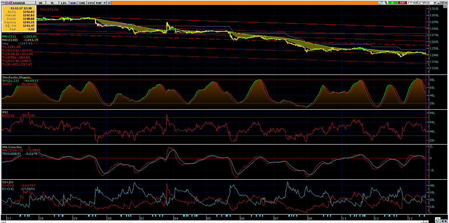 XAUUSD: Altında dolar endeksindeki güçlenmeye başlı satış baskısı devam ediyor. 1241 ve 1227 gün içi destekler olurken 1248 ve 1254 gün içi dirençler olarak karşımıza çıkıyor. Yarın fed faiz kararına kadar bu bandın dışına çıkılması olası görünmemektedir.