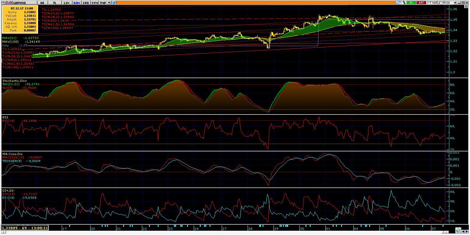 GBPUSD: 1,3515 direncini kıramadıktan sonra başlayan düşüş 1,3360 seviyesinde konsolide olduğunu gözlemliyoruz. Paritede bu seviyelerden güç toplama işaretleri alınıyor. 1,3423 pivot seviyesi altında kalındıkça zayıf seyir devamı beklenilebilir. Gün içi destekler 1,3357 ve 1,3297, Dirençler 1,3395, 1,3424 ve 1,3465 seviyesinde bulunmaktadır.