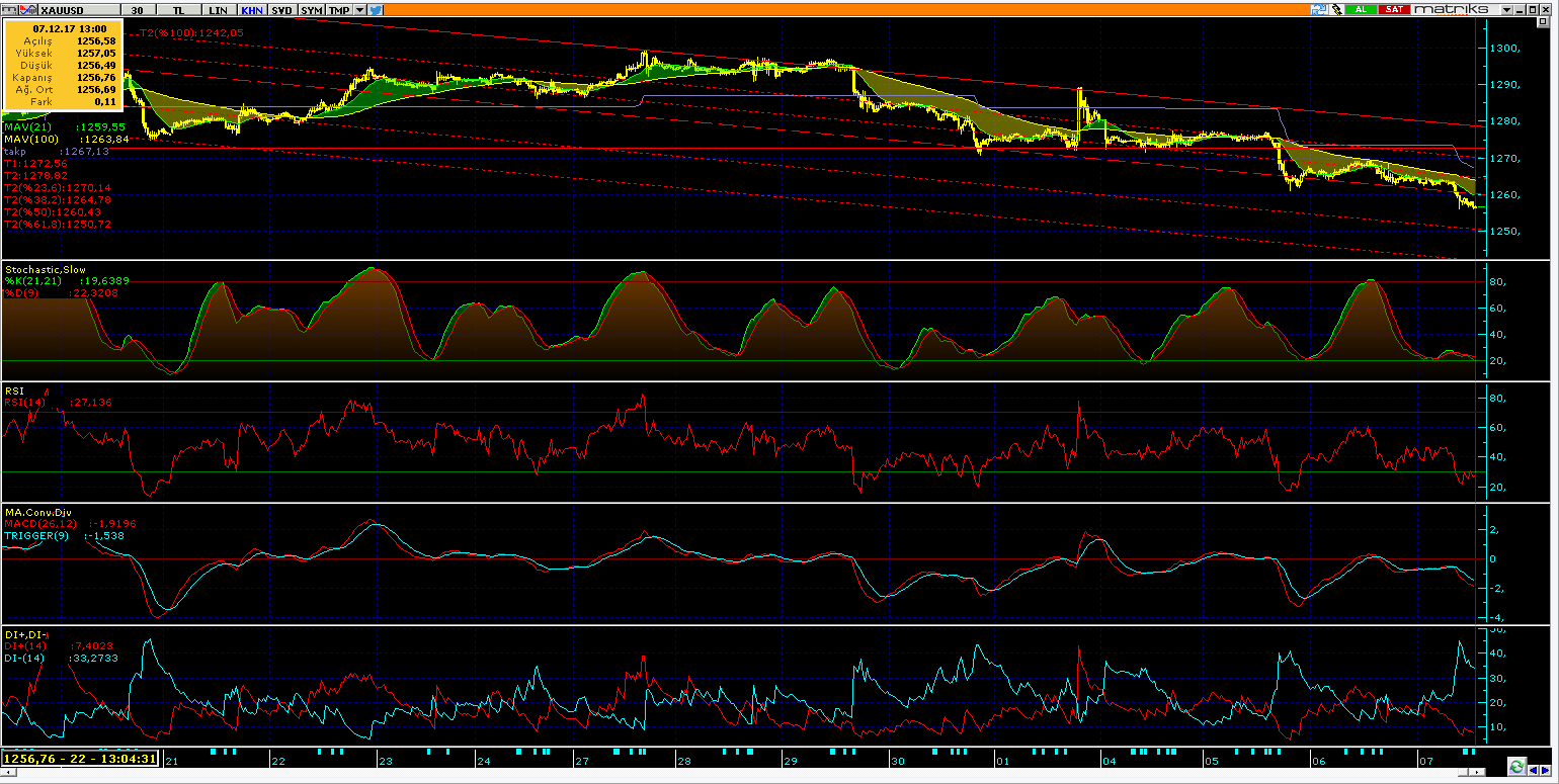 XAAUSD: Altında 1272 dolar seviyesindeki destek kırıldıktan sonra düşüş sertleşti ve 1256 seviyesine kadar düşüş yaşandı. 1260 pivot seviyesi altında kalındığı sürece 1250 ve 1242 dolar seviyesi hedef olacaktır. 1260 pivot üstünde dirençler 1264, 1270 ve 1278 dolar seviyesinde bulunmaktadır. Gün içinde 1250 dolar seviyesi alım bölgesi olarak denenebilir.