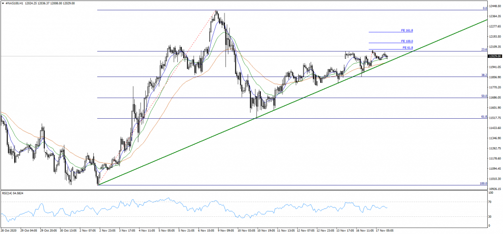 Son dönemde korona virüsüne yönelik aşı haberleri piyasalarda pozitif havanın oluşmasını sağlarken Nasdaq endeksinde hafif satışlar gözlendi. Yalnız 10.954 seviyesinden başlayan yükselen trendin henüz bozulmadığını izliyoruz. Bu trendin güncel değeri an itibari ile 11.980 seviyesine tekabül ediyor. Dolayısıyla bu seviye aşağı yönde geçilmeden henüz anlamlı bir geri çekilmenin oluştuğundan bahsedemiyoruz. Bunun yanında fiyatlamalarda sıkışmanın yaşandığını da belirtmek gerekiyor. 10.954 seviyesinden 12.413 seviyesine yükselişin fibo %23.6 direncinin de 12.070 seviyesine tekabül ettiğini görüyoruz. Dolayısıyla 12.070 – 11.980 bölgesinde oluşan sıkışma dikkatle izlenmeli. Kırılımın oluşacağı yöne doğru fiyatlamaların hızlanma ihtimali bir hayli kuvvetli olacaktır. Bu konuda korona virüsüne ilişkin gelişmelerin baskın olacağını düşünüyoruz.