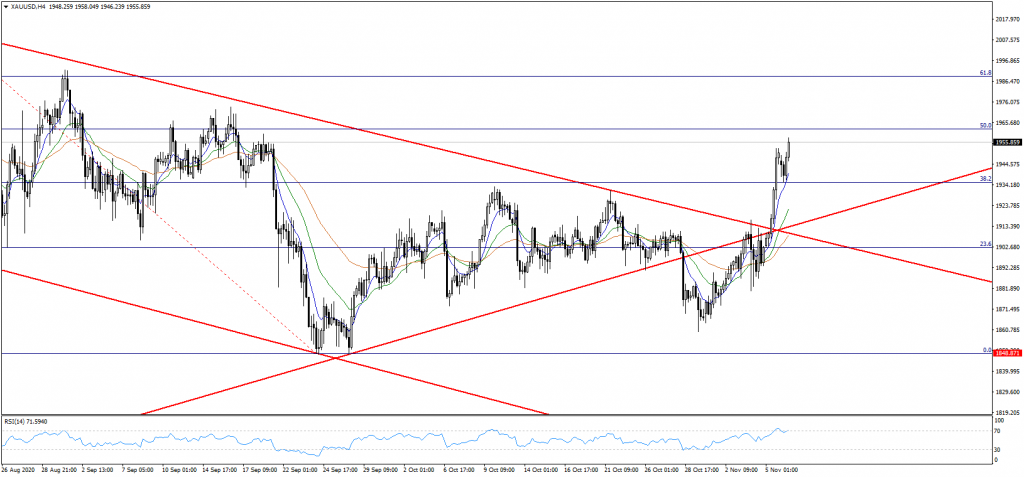 ABD başkanlık seçimlerinde kritik eyaletlerden Georgia’da Biden’ın öne geçtiği haberleri oldukça önemliydi. Georgia 16 delegeye sahip bir eyalet ve burada Biden’ın kazanması başkanlık yolunu açacaktır. Bu haberin etkisi ile küresel ölçekte ABD dolarında ( DXY ) aşağı yönde hareketin hız kazandığını ve bu sayede ons altın fiyatlarında yükselişin güçlendiğini görüyoruz. Son analizimizde 1911 seviyesinin aşılması ile 1935 seviyesinin hedeflenebileceğini ve 1935 üzerinde kalıcılık sağlanması ile yükselişin hız kazanabileceğinden bahsetmiştik. Bu senaryonun gerçekleştiğini görmekteyiz. Mevcut durumda ilk olarak 1962 seviyesini takip etmekteyiz. Bu seviye 2075 seviyesinden 1848 seviyesine yaşanan düşüşün fibo %50 seviyesine tekabül ettiği için izlenmelidir. Dolayısıyla 1962 direnç seviyesinin kırılabilmesi durumunda yukarı hareketin devam edebileceğini ve 1973 ara direnç seviyesi ile 1990 seviyesinin hedeflenebileceğini not edelim.