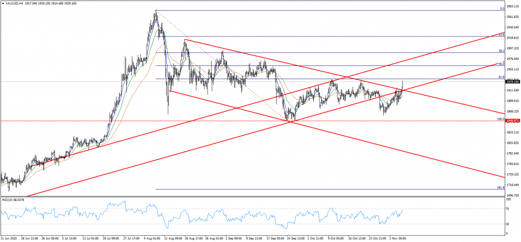 Ons altında yükseliş hareketinin hız kazandığını görüyoruz. Burada en önemli neden ABD dolarının küresel ölçekte değer kaybına maruz kalması… Seçimleri Biden’ın kazanma olasılığının artması sonrası Trump’ın sonuçlara itiraz edeceği beklentileri bir hayli artmış durumda. Böyle bir gelişmenin olması ile kesinleşen sonuçları almak için belli bir süre geçecek. Bu durum da başkanlık seçimlerine ilişkin belirsizliğin bir hayli yükseleceği anlamına gelecektir.