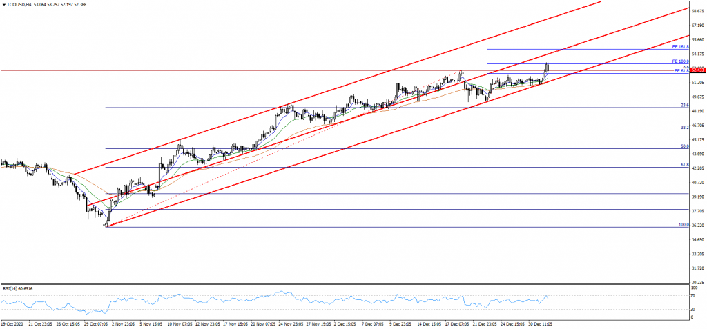 Yıla pozitif başlayan bir diğer enstrüman da petrol fiyatları oldu. Özellikle ABD’de onaylanan 900 milyar dolarlık korona virüs teşvik paketi ile yükselişine hız veren petrol fiyatlarının mevcut durumda $52.40 seviyesinin üzerinde tutunma çabasında bulunduğunu görüyoruz. Yıl içerisinde ise güçlü görünümün sürme ihtimali bir hayli kuvvetli. Bu noktada merkez bankalarının ve hükümetlerin ekonomiyi yüksek likidite ile desteklemeye devam etmesi, ABD dolarında oluşan zayıf seyir ve yıl içerisinde petrol üretim kesintisinin devreye girecek olması fiyatları destekleyecek en önemli unsurlar olarak sıralanabilir. Böyle bir durumda kısa vadede $52.40 üzerinde kalıcılığın sağlanması yükselişin devamı adına önemli olacaktır. Bu durumda $53.10 direncini yakından izlemeyi sürdüreceğiz. Şayet yükseliş hareketi ivme kazanır ve $53.10 direnci aşılabilirse fiyatların yükselen kanal formasyonu orta bandı olarak takip ettiğimiz $54.60 seviyesine doğru devam ettiğini görebiliriz.